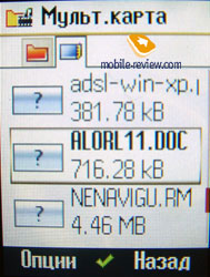 Мои файлы. Представляет собой упрощенный файловый менеджер. В основной памяти отображаются папки со звуками, картинками, видео, темами, папка помощника, игры, приложения, разное. Кроме них есть папка со скинами На карте памяти отображаются все записанные туда файлы, другое дело, что не все они воспроизводятся. Для файлов и папок доступен стандартный набор действий – переименование, перемещение, копирование, удаление. В качестве дополнительных – опция форматирования карты памяти и ее безопасного извлечения. Но карта извлекается корректно и безо всяких защитных ухищрений. Лишь при ее горячей установке аппарат иногда предлагает перечитать данные.