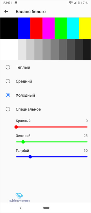 Добавили отдельный «режим создателя» для тех, кто создает контент на смартфоне. В этом режиме цветопередача экрана максимально адаптирована под стандарт sRGB. На мой обывательский взгляд, в этом режиме цветопередача становится более тёплой, поэтому я сам остановился на стандартном режиме. Никуда не делись и стандартные настройки баланса белого, цветопередачи и отдельный ночной режим.