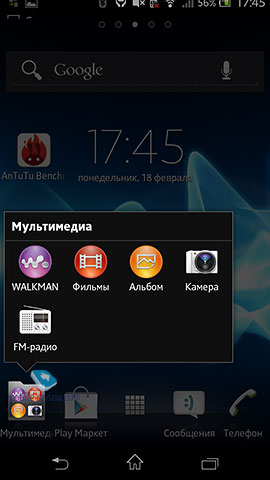 Разъем microUSB с MHL, жаль, что в комплекте нет соответствующего кабеля - это бы облегчило подключение к телевизору. Слайдер разблокировки аппарата можно использовать для запуска камеры, обратите внимание, что все основные мультимедийные приложения собраны в одной папке на рабочем столе, это удобно и менять не хочется. Есть радио, из года в год продолжается не самая лучшая история под названием Timescape, я эту утилиту сразу же убираю.