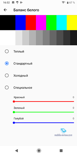 В настройках экрана вы можете выбрать один из трех цветовых профилей, а также настроить баланс белого или изменить масштаб интерфейса.