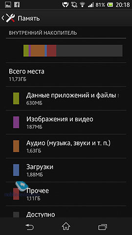 КамераФронтальная камера 2,1 МП, можно снять хороший автопортрет, поддерживается видео с разрешением 1080p, сзади - объектив основного «фотоаппарата», 13 МП (Sony Exmor RS), LED-вспышка, много любимых мной настроек. Естественно, автофокус, панорама и других привычные для Sony функции. Кстати, интересный режим Burst, нажав кнопку, аппарат начинает снимать непрерывно и потом загоняет все кадры из буфера в один альбом, как говорят коллеги, удавалось делать таким образом до тысячи снимков (видимо, потом надоедало). Это хорошо для динамичной съемки, например, если у вас есть дети или домашние животные, можно снимать репортажи на бегу. Интерфейс камеры изменен, на мой взгляд, стал наглядней.