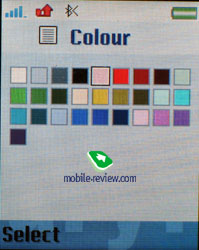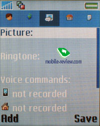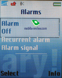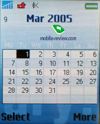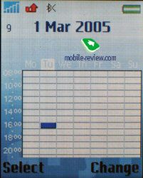 Organizer. In organizer menu a lot of functions are stored at once, first of all - let's review the calendar. There are three types of event view, monthly, weekly and daily. In last case you see the list of all things to do and reminders, in two other modes you will notice the highlighted time with events or the day. Fast transfer to the required year, day and month is present. Everything is pretty simple and traditional, as well as schedule entry. Basically you get the chance to choose one of the 6 icons assigned to the action type, specify the place where it will occur, length and setup reminder (beforehand or in the entered time). I was unable find a way to setup reoccurrence rate; in my samples this feature was not present at all. From the editing menu for separate events you can choose another time and date, and that's it. Reminders work even if the phone is turned off, in case you turn on this function in the settings menu. Pleasant peculiarity of this model is that you can turn on/off automatic switch of profiles after the event had occurred, as well as return to the earlier set profile after the event is over. Basically we get analogue of Time Profile function in Nokia's phones. ![]()