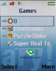 video (3GP, 171 KB) A short summary of the camera is the following. There are no evident problems, outdoors the camera corresponds with a medium level and is typical for modern devices. Low resolution for video may be considered a minus. Such cameras get mass for the company, that is a standard solution. Java. The phone supports Java (MIDP 2.0), as well as 3D-engine, which allows launching truly three-dimensional games (not only Mascot Capsule is supported but JSR-184 also). Some games already known by other models of the company are preinstalled.