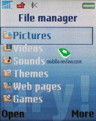 Radio. The phone has a built-in FM tuner; it is different from other versions in RDS support that is a creeping line with information transmitted by the radio station, a copy of the same function in car radio player. The phone's memory can store up to 20 radio stations; the stereo headset that is shipped in every package plays the role of antenna. In case you are using auto-search the phone will find about 6-7 stations with the strongest signal's coverage (at least it did it in Moscow) and store them in the memory. At the same time radio stations with weaker signal, but pretty suitable for listening will be skipped. They can be added into the list manually. This parameter is identical to Nokia phones, in which same problems are noticed. Signal's playback quality is rather high, the headset allows setting up almost any volume, maximal level is extremely loud, and the music will suppress everything. The user can switch the radio into the loudspeaker mode; in this case people around will hear it as well. The radio's volume is pretty high. Unfortunately, all control is made from the phone's keyboard. Channel switch which are stored in the memory - joystick's vertical movement. You can regulate the volume with the help of side-buttons. In case you want to turn off the radio and move on to other menu item's functions you will have to minimize it the way you are doing it on your desktop PC. In order to have the ability of changing channels again you will have to call Radio mode again. In minimized condition appropriate icon will appear. Brief impressions from the radio can be described as positive, this phone's parameter is interesting, more than that, it offers quality realization. The radio is not worse than in Nokia's products and this speaks out for a lot of things, as well as the fact that the radio works in stereo mode. File manager, amount of memory. The user can have about 38 Mb of free space, on which his data, files (pictures, video clips, and applications) can be stored. Remaining memory is occupied with pre-installed applications, which you cannot delete. Part of phone's memory is used as phonebook, call list etc. There is no much but enough free space for keeping personal photos taken with the megapixel camera due to the absence of a memory card. Considering the easiness of copying data to a PC, it can't be taken as a serious disadvantage, though the restriction exists and should be taken into consideration if photo component is important to you. The phone also gained simple file manager, with its help you can sort files into various folders, create directories in the phone's memory and store files in them. Using internal memory for file storage is impossible; the phone declined storing files with unknown extensions. But if you rename the file (its extension) it will be easily stored in the phone's memory. Meanwhile when we tried to view it, it lead to error; however the phone did not freeze and continued working. In future you will be able to send files via IrDA and Bluetooth in near future. Basically we face the fact that the phone can be used as file storage for very important files.