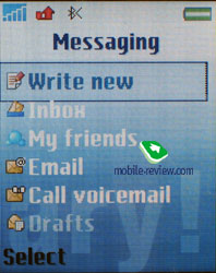 Several phone numbers, e-mail address and other contact information may be kept for a name in the internal memory. In settings you can choose the required fields, as well as sorting by various fields including name, surname, but the input field remains single. Such sorting is important only while transferring data from PC, for phone's entries it's actually useless. For separate names you can setup custom ring tones and own picture, while the incoming call you will hear the custom ring tone, as well as chosen image. While information input you are free to scroll between bookmarks, on the first one phone number entering and their sorting according to types. Actually this organization reminds Outlook for some reason, it is convenient. Ability to add voice dialing to separate numbers stored under one name was introduced as well, there can be up to 40 of them in total. If you remember, earlier on voice dialing was supported only for names, and you had to make additional voice dialing bookmarks for other phones stored under the same contact. While viewing the phone book you can scroll the numbers by the horizontal joystick's keypress, as well as watching other information. Of course the default number will be bind by you. Traditionally the company believes that SIM-card and its memory will be used only in emergency situations, and not for storing information continuously. Viewing the entries on the SIM-card is possible from the separate menu item; they are not displayed in the common entry list. Messages. All functions are basic for messages; templates and ability to create your own ones are present. For messages storing phone's memory as well as SIM-card's is used. Chat function is supported, on the whole I can say that the features are pretty common for any other phone. Appeared emoticons should be mentioned as well, they are made on a new quality level, and support youth part of the phone.