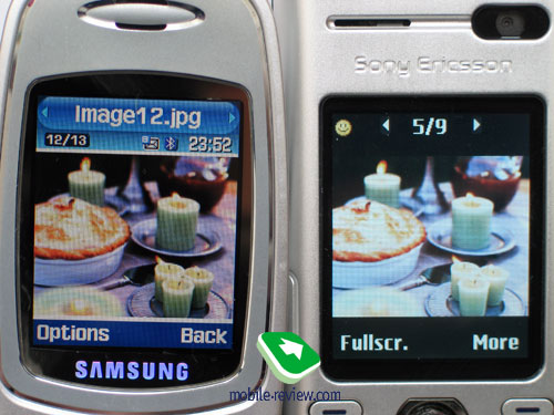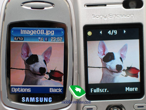 There is a VGA-camera gap to the right of a loudspeaker grate, it serves for videocalls, it can't be used for taking photos and that is quite logical considering the presence of a 1.3 MP camera. At the same time it is possible to switch to the main camera in the videocall mode, and then the phone is better to turn horizontally. The loudspeaker grate is displaced to the left a bit because of the camera disposition and that can make problems with the sound quality at first sight. Materially, there are none of them, you need no extra positioning of the phone, everything is natural and calm. The screen has the resolution of 176x220 pixels (28x36 mm) showing up to 262K (TFT). Physically, its matrix has no differences from the previous models, and the increased number of shown colour is caused by using another controller. You won't see any principal difference between 65K and 262K in the screen, though it is qualitative, the picture is good, vivid and the interface drawing is very pleasant. Te display gives way to Samsung and Sharp models in the picture brightness, and in general more belongs to their group rather than to the middle-class. No cavils to the screen may appear in its class, and moreover, it is obviously one of the best in this form-factor. The picture fades in the sun, but text remains readable. To tell the truth, small font-size prevents from seeing all the necessary details sometimes (this doesn't concern SMS and names in a phonebook, here everything is all right).