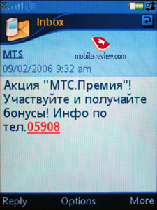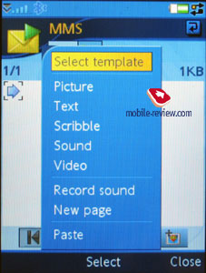 В основном меню Сообщений под папкой Входящие отображаются отдельно все почтовые аккаунты. Если у вас их три, то будут отображаться все три в последовательности занесения в аппарат. В папке Входящие указывается тип каждого сообщения (SMS, MMS, Beam), вы видите соответствующую иконку. Создание сообщения возможно практически из любого меню аппарата, в котором присутствует номер. Вы выбираете тип сообщения (SMS/MMS) и начинаете писать его. Под именем SMS-сообщения на самом деле скрываются и EMS-сообщения. Пользователя изолировали от принятия решения, какое же именно сообщение ему надо создать. Коли пишется только текст, то это будет SMS-сообщение. Если вы выбираете не только смайлики, но и мелодии, картинки, форматируете текст (речь не о функции Zoom), то сообщение автоматически превращается в EMS. Стандарт поддерживается в полной мере, тут нет никаких сюрпризов. Объединенные сообщения показываются в общем списке как одно сообщение, при наборе число сообщений отображается в стандартной манере (например, 1/2). Отдельно хочу отметить, что обновленная система Т9, которая подбирает вводимые слова и предлагает их окончание, сильно облегчает жизнь (аналогично тому, как это реализовано в телефонах Motorola). Другой плюс в том, что аппарат запоминает и целые сообщения (они хранятся в динамической памяти, ее объем оценить не удалось, подчеркиваю, это не Черновики). При начале ввода слова, которое было в предыдущих сообщениях, на экране начнут появляться все слова сообщения, вам останется либо выбрать его, либо продолжать ввод. Первое отличающееся слово – и с экрана исчезнет остаток сообщения. Идеальный способ хранения временных сообщений, которые вы не хотите вносить в Черновики. Из особенностей ввода текста также стоит отметить автоматическое изменение регистра при наборе. То есть первая буква предложения всегда заглавная; функцию можно отключить. Для обычных сообщений также можно отключить преобразование текстовых смайликов в их графическое представление. Отдельное сообщение можно отправить сразу многим абонентам, вы выбираете их при отправке из списка контактов, достаточно отметить имена или выбрать отдельные номера контакта. Массовая рассылка может осуществляться сразу для групп абонентов. При ответе на полученное сообщение вы имеете возможность выбора между SMS/MMS-сообщениями (в списке нет ответа почтовым сообщением). Создание MMS-сообщения приятно, есть несколько закладок, вы можете выбрать тайм-аут между страницами, создать свои шаблоны. Помимо стандартных файлов (графика, видео, фотографии, музыка и т.п.), к сообщению можно приложить эскиз, сделанный вами от руки на сенсорном экране (Scribble). Все стандартно, при отправке выбор контактов аналогичен SMS-сообщениям. Для MMS-сообщений присутствует возможность заказать не только отчет о доставке, но и отчет о прочтении сообщения.