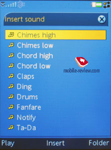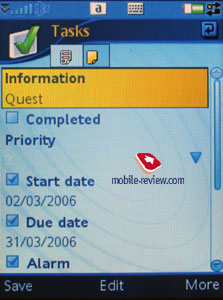 В календаре за месяц дни с записями выделены соответствующими значками справа от цифры. Всего предполагается четыре типа событий – Встречи, Напоминания, Годовщины и События на весь день (appointments, reminders, anniversaries, all-day event). События могут быть повторяющимися, для них выставляются свои варианты звуковых предупреждений. Органайзер поддерживает формат записей vCalendar версии 1.0, при этом есть поддержка работы в группах посредством стандарта iCalendar. На практике это выглядит как возможность отправки запроса встречи, используя почтовый клиент. Ваш визави может ответить отказом, если время его не устроит, или подтвердить встречу. Во втором случае полученное сообщение из папки Сообщения автоматически будет добавлено в органайзер, в календаре появится соответствующая запись. Также до получения ответа вы можете просмотреть состояние своего запроса. Функция выглядит экзотичной на данный момент, но через полгода она может стать востребованной в малых группах разработчиков, среди компаний. Из стандартных функций есть отправка записей календаря на другие устройства с использованием ИК-порта или Bluetooth. Естественно, поддерживается и прием таких сообщений, после просмотра их вами они моментально попадают в календарь. Полноценная реализация SyncML (новое имя OMA DataSync) позволяет синхронизировать данные с любым совместимым со стандартом устройством (будь то ПК, КПК или телефон). Список дел. Записи между органайзером и списком дел переносимы. Аналогично органайзеру, пользователь может создать резервную копию Списка дел на внешней карте памяти. Пользователь может создавать неограниченное число категорий, по которым будут сортироваться вводимые дела. Приоритет устанавливается от 1 до 3 (низкий, нормальный, высокий), есть ограничение по времени задачи, установка сигнала (выбор мелодии остается на плечах пользователя, может быть любой сигнал). Предполагается сортировка как по категориям, так и по списку выполненных задач (они могут быть скрыты), по указанной дате окончания, приоритету. Поддерживается SyncML, синхронизация с MS Outlook корректна. Отправка отдельных записей возможна на любое устройство с использованием ИК-порта или Bluetooth. Также такие записи могут отправляться в теле сообщений. Будильники. Функция времени работает в привычном стиле, так же, как и на предыдущих моделях. Несколько будильников могут быть выставлены на различное время, причем устанавливается повтор по определенным дням, выбирается любая мелодия сигнала.