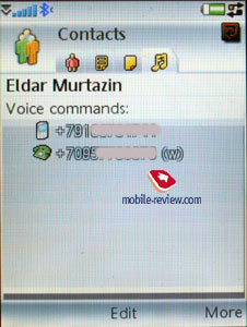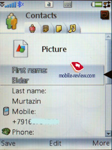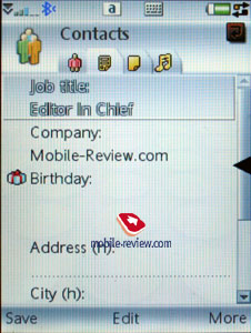 Поиск в общем списке может осуществляться по первой букве или по нескольким буквам (строка вверху – это полноценное поле поиска). Сортировка записей на двух языках осуществляется стандартно: сначала все английские записи, затем записи на другом языке. Лучше всего заводить все записи на одном языке, иначе искать их будет не очень удобно. Для отдельного имени вносится неограниченное число номеров телефонов различного типа, первый номер становится номером по умолчанию. Дополнительные номера, сверх тех, что представлены в стандартном отображении, добавляются из меню. В общем списке просмотр отдельных номеров осуществляется горизонтальной прокруткой, тут же выводится и дополнительная информация (например, адрес электронной почты и т.п.). В отличие от стандартной реализации UIQ 3.0, разработчики Sony Ericsson создали четыре закладки в режиме редактирования контакта, а не три. Первая служит для ввода информации о телефонах, выбора категории или, если хотите, группы. Особенность в том, что отдельное имя может принадлежать различным категориям абонентов одновременно (удобно для работы в группах, массовой рассылки сообщений). Вторая закладка служит для ввода информации о дне рождения, положении в компании, названии должности, адресе (несколько полей), служебном адресе. Третья закладка – это всего лишь текстовая памятка, прикрепленная к контакту. Четвертая закладка содержит голосовые команды (прикрепляются к номерам телефонов), плюс выбор персональной мелодии звонка (если есть групповая мелодия, то она заменяется при звонке персональной, у последней высший приоритет). Как мы видим, нестандартной является закладка с текстовой заметкой. В режиме просмотра записи вы можете в одной касание начать писать сообщение для выбранного номера (во всплывающем окошке надо выбрать SMS- или MMS-сообщение), если выбирается адрес электронной почты, то стартует встроенный почтовый клиент. За счет того, что быстрый выбор разнесен теперь на три экранных клавиши (левая, правая, центральная), управляться с аппаратом стало легче. IM-клиент интегрирован в Контакты, вы можете отсюда просмотреть состояние собеседника и перейти в соответствующее приложение (это нестандартная реализация UIQ). Для сторонних разработчиков вообще остается большое поле для деятельности, гибкость интерфейса высока, через соответствующее API организуется полный доступ к Контактам. По сравнению с UIQ 2.1, потенциальные возможности для творчества очень высоки, думаю, что в короткие сроки появятся надстройки над стандартной книгой контактов. Присутствует встроенный менеджер контактов, он позволяет отправить выбранные записи (категории) на другие устройства, используя ИК-порт или Bluetooth. Аппарат поддерживает стандарт vCard 2.1. Точно так же можно и получить записи с других устройств. К сожалению, так и не исправлены проблемы отправки контактов на ряд телефонов, в частности, Sony Ericsson K750. При массовой отправке всех контактов зачастую путаются номера телефонов, они соотносятся с другими именами. При синхронизации с ПК или КПК никаких проблем не наблюдается. При отправке одной записи поля соотносятся корректно. Для переноса данных на обычные телефоны остается необходимость использовать в качестве промежуточного звена MS Outlook. Полноценная реализация SyncML (новое имя – OMA DataSync) позволяет синхронизировать дан