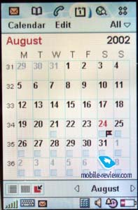 Interesting, that you can use almost any sound file, spaced in the memory of P800, as a ringing tone for your calls. Our experiments showed that large files (more than 150Kb) are not played though you can setup them. A polyphonic ringing tone is another advantage of P800, the volume is good. You can record not only any melody, but your own voice or other sounds which you like. An access to the list of last calls is under this submenu too. A phone number, a kind of ringing tone (тип звонка??), its duration and the date - all this information you can view in the list. It's possible to sort the calls (outgoing, incoming, missed, all). Calendar or organizer. I don't want to describe all the possibilities of this application. In my opinion this organizer is similar to those in PDAs under PocketPC 2002 control. You can view tasks by week, month and day, set repeating events, reminders and so on. Almost all tastes will be satisfied. ![]()