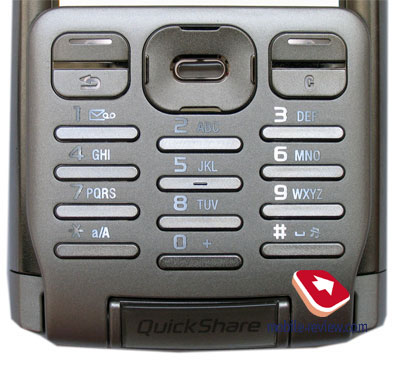 Вернемся к лицевой панели. Вверху слева находится фронтальная камера для видеозвонков, справа расположился системный индикатор. Флип о котором немало уже сказано, имеет кнопки, максимально схожие по ощущениям с таковыми на Sony Ericsson P900. Они тонкие и не столь удобные в работе, как клавиши на Sony Ericsson P910. Подсветка белого цвета неравномерна, правый ряд освещен сильнее. Обозначения рядом с клавишами, однако, видны хорошо. Джойстик, находящийся по центру, не позволяет работать комфортно людям с большими руками, вписанная в него кнопка ОК, слишком мала. В то же время, в большинстве случаев левая софт-клавиша заменяет ее, что делает общение с аппаратом более комфортным.
