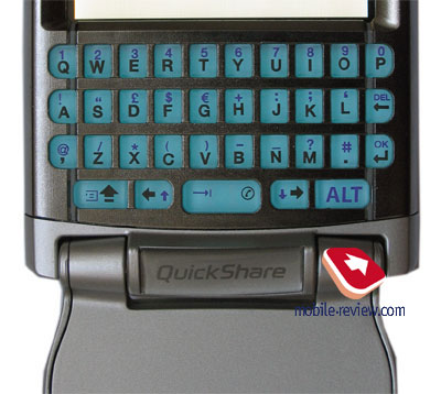 Под экраном в раскрытом состоянии находится QWERTY-клавиатура (можно вообще снять флип, тогда клавиатура будет всегда). Кнопки небольшие по размеру, но больше таковых на откидном флипе Р910. Работать с клавиатурой необходимо двумя руками, одной рукой это делать затруднительно. Подсветка кнопок синего цвета и хорошо видна в различных условиях. Комфортность работы с клавишами средняя, она явно выше таковой у Р910, но ниже более широких по размерам устройств.