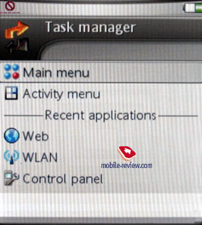The left corner of the status bar shows an up arrow, it allows a pop-up menu. As a rule, it shows the launch of standard applications. They are hidden behind the New entry, and then you can select a call, message, contact, meeting, task, note, sound record. This is a comfortable way to launch a necessary application by two stylus touches. Also here you can see time, adjust sound for all events (both volume and select a melody). Finally, this very menu contains all the connections, which are launched in one touch, and this is undoubtedly a plus (now you do not need to call the control panel and launch Bluetooth and IrDA from there). Task manager. Two arrows directed towards each other are shown in a status bar to the right; this is a task manager icon. Using old UIQ versions, previous models really lacked such a capability, now you can call a list of last run applications and run them again from here. The device uses preemptive multitasking.