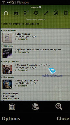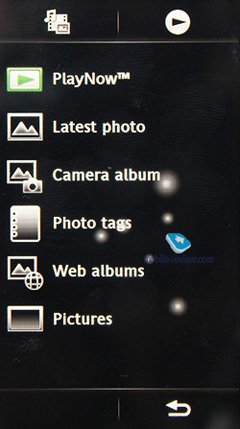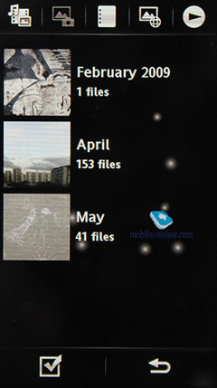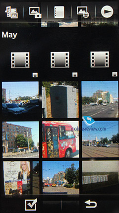 There is a window with applications shortcuts and the player launch (its controls are displayed here as well), date, time and the selected profile. The workspace is arranged conveniently and instinctively easy to use. Unfortunately, nowhere in the menu (apart from the quick dialing list) we can use touch panning (it is routinely supported in Nokia products). It is a negative feature of the interface. Media menu was borrowed from A200. You have PSP style from Sony. You see different sections, can select photos, video and music. This application easily beats the standard gallery from Symbian. On the downside we have the slow presentation of pictures, but it is caused by the slow speed of reading from the memory card.