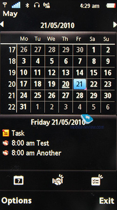 Video recording. The company decided to make this feature central for the model. HD recording is available with the resolution of 1280x720 at 24 frames per second. The recording quality is decent, but there is not much of a difference in comparison with other models on the market. Unfortunately, the cheap matrix does not allow getting the quality similar to comparable Samsung models. Back to the table of contents >>> Software Details and Sony Ericsson Add-OnsThis model is based on S60 5th Edition and I am not going to describe many features and will refer to a separate article. The work with contacts, messages, organizer and other standard applications is described here: