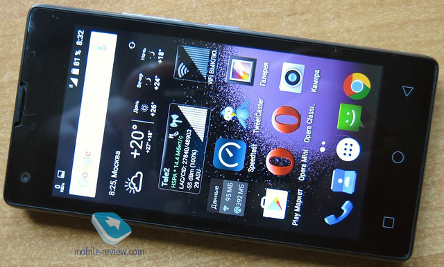 Бенчмарк AnTuTu присвоил аппарату 14 534 виртуальных «попугаев». Для бюджетного смартфона нормально, но далеко не все игры пойдут на максимальных настройках. Нехватка оперативки ощущается даже на «бытовом» уровне: после закрывания в браузере страницы дико перегруженного рекламой новостного сайта смартфон на несколько секунд теряет работоспособность. Видимо, очищает память от тонны залитого в неё хлама. Для экрана 4,5 дюйма разрешение 854 x 480 при плотности пикселей 218 ppi признаем удовлетворительным для бюджетного аппарата. Нечёткость шрифтов и тонких линий присутствует, под углом цвета искажаются. Для матрицы TFT-TN экран неплохой, могло быть (и бывает) хуже. Запас по яркости приличный, в солнечную погоду экран остается читабельным. Софт Mira Vision для настройки баланса белого, контрастности и других параметров экрана присутствует, для матрицы такого класса это очень важный плюс. Автонастройка яркости есть, работает корректно и плавно. Основная камера 3.2 МП без автофокуса худо-бедно годится для съёмки при хорошем освещении. При съёмке в дневное время на улице качество снимков позволяет выкладывать их в соцсети, но не более того, фото нерезкие. Рассчитывать на приличный снимок в помещении не приходится. Цветопередача терпимая, но снимки часто «уезжают» в голубизну. Светодиодная вспышка имеется, и она оказалась чуть лучше, чем совсем «символическая». Но всё равно толку почти нет, сойдёт в роли фонарика. Читал жалобу на голосовой динамик, не подтвердилось. В моем экземпляре всё хорошо, я бы сказал, что даже лучше среднего. К микрофону претензий нет. Мультимедийный динамик достаточно громкий. Гарнитуры в комплекте нет, гнездо 3.5 мм стандартное. Съёмный аккумулятор 1700 мАч отрабатывает день нормальной нагрузки.