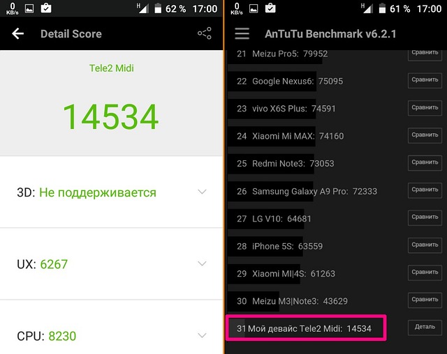 Как уже написал, AnTuTu выдал аппарату 14 534 виртуальных «попугая». По нынешним временам маловато даже для бюджетника. И это «маловато» заметно даже в повседневной эксплуатации без серьёзных нагрузок.