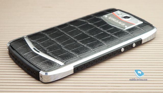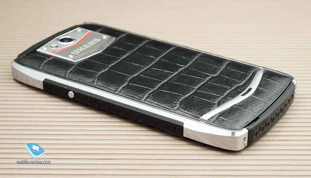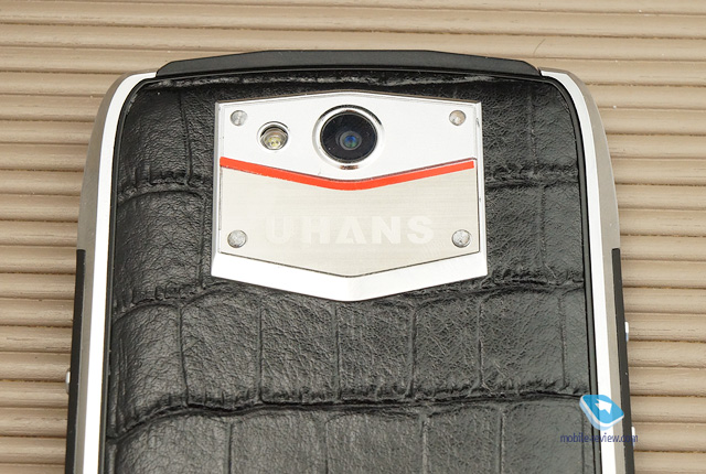 Большая часть боковых граней – толстое металлическое обрамление (шлифованный алюминий). Толщина слоя может достигать 4 мм. Между корпусом и металлом находится пластиковая рамка. Справа и слева – резиновые вставки с узорами. Сверху и снизу – аналогичные, но обрамлены матовым пластиком. С обратной стороны расположена металлическая бляшка с шестью углами и ярко-красной пластиковой вставкой по центру в виде галки. Выдается над корпусом примерно на пару миллиметров, держится якобы на заклепках. Сверху выгравирована надпись «UHANS». Снизу можно заметить хромированную «железную» дугу, в центре которой находится отверстие для динамика. Ну, и самое главное – материал крышки. Это натуральная кожа вола, по крайней мере, так утверждает официальный источник. О фактуре я уже высказался выше во введении. Кроме того, на сайте компании сказано, что Uhans U200 переносит влагу. Однако не стоит надеяться на определенную степень защиты, несмотря на то, что любой аппарат без проблем работает во влажной среде, например, лежит в ванной комнате, когда вы принимаете душ (естественно, без погружения его в воду и без прямого попадания на него брызг), или когда у вас просто мокрые руки. В целом, лично мне дизайн и исполнение нравятся, хотя многие утверждают, что смотрится несколько «колхозно». Откровенно вам скажу: многие аппараты Vertu тоже выглядят слишком просто и порой несуразно, а стоят на несколько порядков дороже U200 (между прочим, ТТХ телефонов британской компании часто намного хуже, чем китайских).