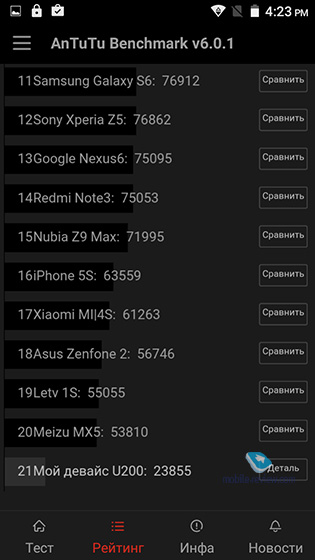 Примеры фотографий ПроизводительностьУстройство работает на тайваньском чипсете MediaTek MT6735. Это 64-битный SoC, который содержит 4 ядра ARM Cortex-53, техпроцесс – 28 нм, тактовая частота каждого – до 1.5 ГГц. В качестве графики используется Mali T-720 с поддержкой Open GL ES 3.0 и Open CL 1.2 API. Если говорить об оптимизации софта, то в Uhans с этим все отлично: интерфейс работает плавно, без каких-либо намеков на тормоза, приложения запускаются быстро. С игрушками тоже все более-менее нормально, но не стоит рассчитывать на максимальные параметры и 60 FPS. Необходимо отметить, что чип MT6735 создавался как недорогое решение для использования в устройствах, которые могут функционировать в различных сетях. Поэтому основная его фишка – LTE, а не высокая производительность в играх. Информация о системе
