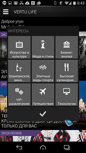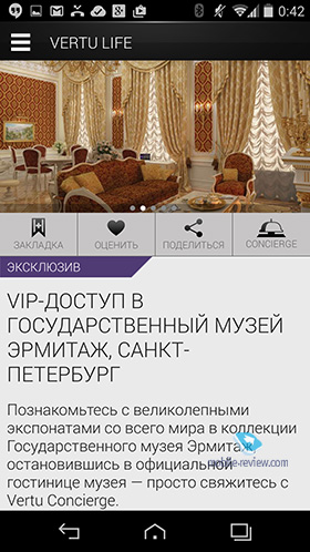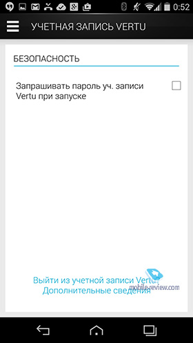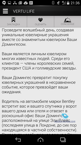 Коммуникационные возможностиВ Vertu очень гордятся тем, что в аппарате есть десять LTE-антенн и он сможет работать везде в мире (Китай с его вариантом 4G – исключение). Приведу список коммуникационных возможностей для этого аппарата: Программные особенности – Android 4.4Этот аппарат является первым в линейке Vertu, что выходит на последней и самой свежей версии Android. В Vertu не стали мудрить и писать свою оболочку – в аппарате ряд заставок в фирменном стиле, обои, а также мелодии, которые созданы Лондонским симфоническим оркестром. На мой взгляд, то, как звучит Vertu, стало визитной карточкой этой марки, мелодию узнать легко в любом месте, а когда кто-то ставит ее в мр3-варианте на обычный телефон, это также легко различимо. Красивые мелодии, которые завораживают, и за это телефону можно простить многое.