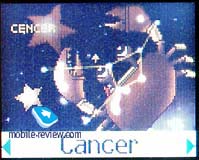 Phonebook. Up to 100 phone numbers can be stored in the phone memory. But only one number can be added to one name. Up to 8 phone numbers can be assigned to speed dialing. The phone displays phone numbers from both memories: phone memory and SIM-card memory. There is a search by name and phone numbers. In general, this phonebook offers standard possibilities. Messages. Up to 20 messages can be stored in the phone memory. The handset supports only SMS-messages, not EMS and MMS. There is a predictive text input – eZi, similar to T9. In out phone it was available in Russian and in English. In general, the phone always supports two languages: English and language of the county, which the phone is supplied to. Display. It is the first item of the main menu. You can select one of 6 animated pictures (seasons, children) or any other pre-installed picture. Varity of available pictures is really great. Besides it is stated that you could download your own pictures. Among pre-installed pictures you can select one of the 12 zodiac animals; they can be automatically changed depending on the month. ![]()