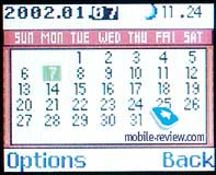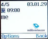 There is also a set of funny pictures. Besides, you can set clocks (digital, analogue, 2 time zones), calendar (monthly and weekly view), just a text or simple picture with nature scenery. Sound. The phone supports 40-tones polyphony. It sounds very pleasant. Polyphonic ringer is realized wonderful in this phone. Volume of the ringer is sufficient not to miss calls in quite places. It is not so loud as phones from Samsung or LG. Totally up to 32 ringtones are available in the phone. There are several types of incoming alert: just melody, vibrating alert and mixed mode. You can set the same types of alert and ringtones for alarm-clock. There also 5 tones, which sounds when you call is connected to the system. Phone set. Several settings are hidden here, including date, time and alarm-clock. It can be defined as once or daily repeating. You can also set power on/off alarm function. Besides, you can set a backlighting of the external display here. Other settings are standard. Call set. All settings, which calls are concerned, are located here. For example, calls divert, call barring and etc. Secretary. This menu gives you access to an organizer. You can view the calendar here (weekly, monthly). The phone supports different events (schedule, call, memo, anniversary). It is possible to set a signal reminder. A pleasant peculiarity of the calendar is that it displays a phase of Moon for every day. ![]()