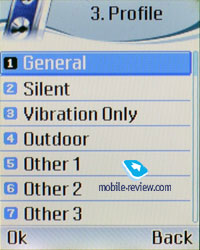 Есть быстрый набор до 7 номеров. В общем списке номера из памяти аппарата и SIM-карты могут отображаться как вместе, так и по раздельности. При входящем звонке фото звонящего отображается в небольшом окне (96х72 точки). Настройки. Здесь находятся будильники. Всего в аппарате их три, каждый может настраиваться на однократное, ежедневное срабатывание или на работу только по будням. Для всех будильников можно выбрать одну общую мелодию, это может быть любой музыкальный файл, в частности и МР3 как из памяти аппарата, так и с внешней карты.