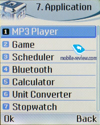 Подключение к ПК осуществляется по USB версии 1.1, но, несмотря на это, скорость загрузки файлов вполне приемлемая. Приложения. В телефоне установлен неплохой аппаратный МР3-плеер, как уже говорилось выше, имеется отдельная кнопка для его активации. Клавиши регулировки громкости, помимо своих основных функций, также позволяют переключаться между композициями, достаточно нажать и удерживать одну из них. Управление проигрывателем осуществляется навигационной клавишей, а функции, которые она может выполнять, обозначены на экране. Имеется поиск по паузам внутри композиции. Есть возможность создавать собственный плэйлист. В телефоне есть пользовательский 5-полосный эквалайзер, а также 4 предустановленные настройки - нормально, рок, популярные, классика. К сожалению, плеер не может работать в фоновом режиме, поэтому, чтобы прочитать пришедшее сообщение, его приходится отключать. Также был замечен небольшой недостаток: при выходе из проигрывателя эквалайзер сбрасывается в нормальный режим. В целом возможности проигрывателя устроят неискушенного пользователя, основные его недостатки - невозможность работать в фоновом режиме, а также жесткая привязка к структуре папок, из-за чего все композиции придется хранить в одной папке, вперемешку.