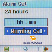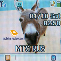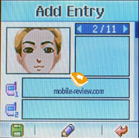 Phone book. Pressing the right function key puts you in the phonebook. There is room for 250 contacts. Each contact may have a name (24 characters for Russian and 28 for English), up to 3 numbers and an e-mail address assigned. One of the 10 preinstalled pictures or a photo may also be assigned. You may also add the names to as many as 10 groups. A name (up to 6 Russian characters and 12 English ones) and a personal call signal may be kept for a group. ![]()