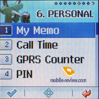 Personal. Up to 10 text notes may be created here (up to 70 characters in Russian and 140 in English). Call duration may be viewed here, but you can't see the total time, only separated for incoming and outgoing. Data counter, PIN setting and passwords are also here.