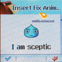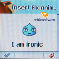 Messages. Up to 80 messages may be kept in the internal memory. The device works also with EMS. There is a small set of preinstalled animations (26), pictures (6) and melodies. Only two alert signals are available for incoming messages. ![]()
