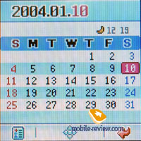 Helper. Here is an organizer with the possibility to view the calendar monthly, weekly or all the events for a selected day. Time and type (meeting, birth date, anniversary, incoming call), repetition (a week, a month, a year), a signal (on time, 10, 30 or 60 minutes before) is set for events. A small text note may be created (up to 20 Russian characters or 40 English). Preview of the just created event is possible.