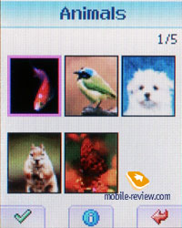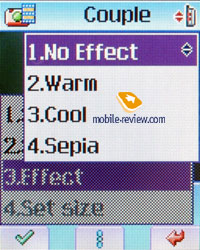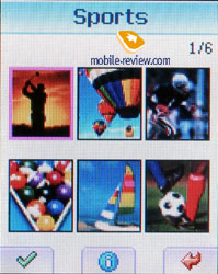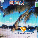 The 5x digital zoom activates by a back and forth deviation of the 4D key and a left and right deviation allows contrast adjusting. The photo resolution could be the following: 640х480, 320х240 and 160х120 and Phone Book photo. There are 10 effects and 16 frames to apply to photos. Multishooting permits taking 6 photos successively with a small interval. There is an option of creating a double photo. Then the screen divides in two parts upright and next two taken frames are joined together. The similar opportunity is realised in Alcatel phones, but there it is called 'mosaic' and permits joining 4 frames. A photo album allows viewing photos one by one and the whole list is impossible to observe. It is interesting that the password may be determined for certain pictures or the whole album so that nobody but you will be able to view. The photo looks well on the phone screen, yet they are not so good on computers. And you should not upload photos to a PC in order not to be disappointed about your expectations. However you ought to take a look at the examples.