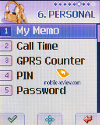 Personals. You may create up to 10 text notes, each of them contents no more than 70 characters. There are call and data records as well as safety settings (PIN, phone passwords).