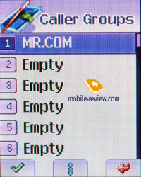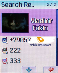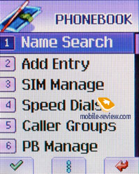 The device supports two menu languages - English and Russian. There is the predicative text input eZi for both languages and runs with no trouble. The phone russianization is well carried out and item titles that do not fit the screen are shown as a creeping line. Phone book. An access to this menu item is assigned to the right softkey. The device holds up to 250 entries. Each entry could have name, up to three numbers and e-mail. Moreover you may appropriate one of 10 preinstalled images or a photo to an entry. The most curious thing is that any photo may not be appended to a contact as it must be created in a special mode - Phone Book photo. ![]()