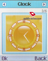 Alarm-clock hides here too. There are three separate alarm-clocks and each could be once, daily and morning activation. And a common melody is set for all of them. There are also internal and external screen settings. You can input your text which the internal screen is to show in standby mode. For the main display, you can choose of one static and one animated pictures for a wall-paper, also there is a set of three types of clock displaying and two calendar views. Besides, the device has six types of clock displaying and one picture for the external screen.