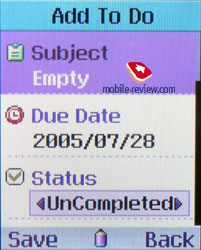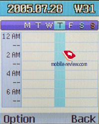 Assistant. There is a phone book, a diary and a file manager. Event list permits viewing events monthly, weekly and daily. Each entry has a time on and off function, repeating is determined, one of seven categories - meeting, call, trip etc. Moreover you are offered to input a title, an address and a text note of up to 20 characters. Also you can set the repetition on weekly, monthly and annually and determine an alert message in the range from 10 minutes to an hour.
