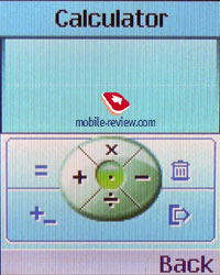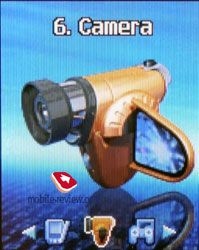 Number keys are averagely-sized and set closely to each other; however, no problems appear when entering a number or SMS. The keypad backlighting is even and blue, al the characters are well read. Both Roman and Cyrillic characters are inscribed on the keys. The Russian letters are a bit smaller and for the moment the font is worse read in incline, which won't please some users. A battery cover is on the back of the device. It takes almost the entire surface. The cover fixing is reliable and doesn't creak, no backlash. The battery integrated is a 720 mAh Li-Ion. According to the manufacturer, with it the phone is capable of up to 130 hours in the standby mode and up to 3.5 hours in the talk one. In Moscow MTS network our sample gave about 2.5 days in case of 20 minutes of talks and up to 1 hour of other functions, in particular, MP3 player a day. The same talk time a day, but 4-5 hours of listening to music, and the battery lasted for 1.5 days. Full recharging takes about 2.5 hours. MenuOnly one representation of the menu is provided, this is an animated full-screen image with a title on the top of the display. Unlike the previous models three small icons are displayed in the bottom, they signify the current menu item and neighboring ones. A quick navigation using number sequences functions is provided in the main menu. Submenus can be switched using the navi button deviations to the left or right.