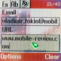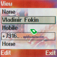 В режиме бездействия экран телефона гаснет, и на нем появляются большие электронные часы – такие же, как в телефоне Sony Ericsson T68i. Единственный момент, что разглядеть часы на экране VS400 довольно проблематично. Локализация меню выполнена хорошо, шрифты хотя и небольшие, но ровные и хорошо читаются. Правда, в некоторых местах встречаются сокращения, хотя их можно было бы избежать, так как места вполне достаточно и поместилось бы слово целиком. Из нововведений стоит отметить, что теперь в аппарате реализована система упрощенного ввода текста Т9 для русского и английского языка вместо системы eZi, которая использовалась в предыдущих аппаратах компании. Всего в аппарате доступно 1.8 Мб встроенной памяти, плюс к этому предусмотрен слот для карт памяти формата miniSD (максимальный объем 512 Мб). При подключении к ПК никакие манипуляции с телефоном и установка драйверов на компьютер не требуются, аппарат сразу определяется как внешний накопитель. Доступна память как телефона, так и карты. Телефонная книга. В памяти аппарата может храниться до 255 контактов, для каждого можно записать имя, до 4 телефонных номеров, адрес, название компании, адрес электронной почты и домашней страницы. Также каждому контакту можно присвоить собственную мелодию вызова и картинку. Кроме этого, в аппарате есть 5 групп, для каждой группы можно изменить имя, присвоить картинку и сигнал вызова. Предусмотрен и быстрый набор до 8 номеров.