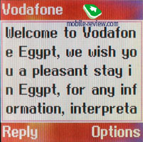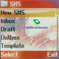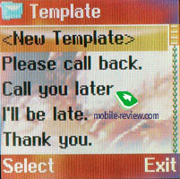 Редактор MMS сообщений прост и понятен, есть возможность создавать несколько страниц, ограничение на объем исходящего сообщения составляет 55 Кб. В аппарате предустановленно три шаблона, кроме этого в памяти может храниться до 33 MMS сообщений.