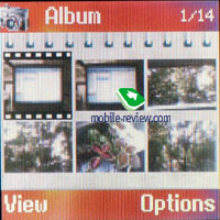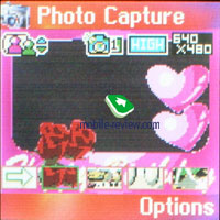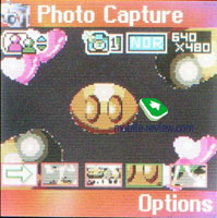 Фотографии можно делать в четырех разрешениях: 80х60, 160х120, 320х240 и 640х480. Доступны три градации качества фотографии: низкое, среднее и нормальное. Есть 4-х кратный цифровой зум, возможность накладывать рамки. Вспышка может быть включена постоянно или только во время съемки. Предусмотрена и мультисъемка: от 3 до 9 снимков.