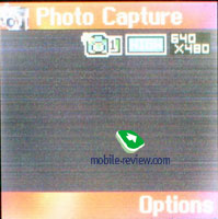 Камера. В телефоне установлена VGA камера, при ее активации картинка на экране разворачивается в альбомный режим, так что для удобства съемки телефон придется держать боком. В режиме съемки на экране отображаются три иконки режимов: одинарная или мульти съемка, качество фотографии и разрешение. Основное меню настроек вызывается нажатием на левую функциональную клавишу, пункты показываются по одному. В левом верхнем углу можно видеть иконку того или иного пункта, а внизу иконки возможных установок.
