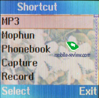 МенюПрограммная часть аппарата была полностью переработана. Главное меню теперь представлено 9 иконками, три столбца по три иконки в каждом. Подменю представлено в виде вертикальных списков. Вход в меню осуществляется нажатием на левую функциональную клавишу в режиме ожидания. За правой функциональной клавишей можно закрепить доступ к любому из пунктов меню, для этого достаточно в режиме ожидания нажать и удерживать клавишу, после чего на экране появляется список, в котором можно выбрать нужный пункт.