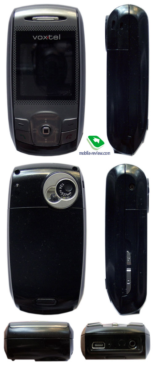 На левой боковой поверхности располагается только отверстие для крепления ремешка или шнурка, на правой стороне в небольшом углублении находятся две клавиши, одна из которых отвечает за активацию МР3 проигрывателя, а вторая - камеры. На нижнем торце располагается разъем miniUSB и 2.5 мм разъем гарнитуры. Использование стандартного разъема miniUSB позволяет без проблем подключить телефон к ПК. В комплекте с аппаратом кабель поставляться не будет, но приобрести его отдельно не проблема, да и у многих наверняка он уже имеется (например, от цифровой камеры). На лицевой части располагается небольшой cSTN дисплей с разрешением 128х128 точек (28х28 мм), способный отображать до 65 000 цветов. Использование STN дисплея было необходимо для снижения конечной стоимости продукта. Качество отображения картинки на экране хорошее, правда, на солнце увидеть на нем информацию трудно.