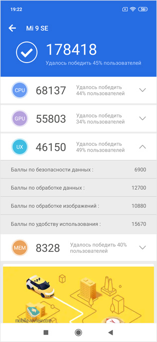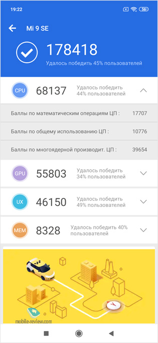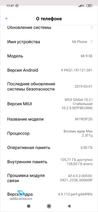 В тесте производительности Antutu Benchmark смартфон Mi 9 SE набирает 170 000 баллов. Этот результат позволяет ставить аппарат на одну «полку» с устройствами средней мощности, если так можно выразиться. Троттлинг присутствует: примерно через 5 минут максимальной нагрузки процессора производительность снижается на 20%, спустя 10 минут – на 30%, а частота снижается с 2.3 ГГц до 1.9 ГГц. На 15-й минуте производительность начинает плавно увеличиваться, но через 5 минут снова падает на 30%. И так по кругу. Под нагрузкой корпус телефона нагревается примерно до 44 градусов по Цельсию. Остывает быстро. От гаджета вы не дождетесь микролагов или тормозов системы – все идеально «вылизано» с точки зрения плавности работы UI. Если мы говорим об играх, то почти все они запускаются на максимальных параметрах. Данная модель оснащена системой Google Android версии 9 и оболочкой MIUI 10.2.5.0 Global (PFBEUXM). Полный обзор пользовательского интерфейса можете прочитать по ссылке ниже: