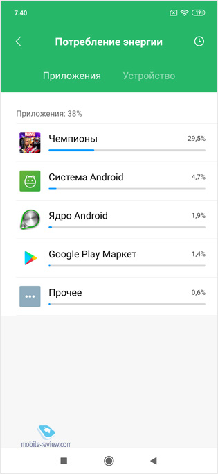 Итого: привычный, но качественный SuperAMOLED экран с неплохими параметрами яркости и цветовой гаммой. Время работыРазработчики компании Xiaomi немного уменьшили Mi 9 SE в габаритах (относительно флагманской модели), видимо, поэтому установили в новинку батарею не 3300 мАч, а 3070 мАч. Кроме того, в Mi 9 SE используется иной процессор от Qualcomm. Совокупность «железа» и софта упрощенной версии смартфона сыграли свою роль: если Mi 9 выдавал почти 20 часов видео, то Mi 9 SE проигрывает фильмы в течение 11 часов; если Mi 9 в играх мог держать заряд около 10 часов, то Mi 9 SE – 6.5 часа. Среднее время свечения экрана Mi 9 SE на автоматической яркости – до 5 часов. Телефон спокойно работает с утра и до глубокой ночи (все зависит от нагрузки и уровня яркости подсветки экрана).
