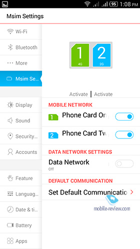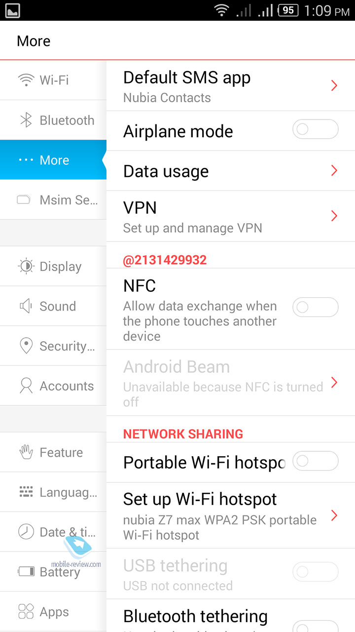 АккумуляторВ смартфоне ZTE используется несъемная литий-ионная (Li-Ion) батарея емкостью 3100 мАч. Производитель никаких цифр не предоставляет, а мы на это и не обижаемся – протестируем образец сами. Если пользоваться телефоном примерно 20-23 часа, то аккумулятор полностью разрядится при условии 30 минут разговоров в день, 6 часов постоянного использования Wi-Fi-интернета (Twitter, почта, скачивание приложений и их установка), около 5 часов мобильного интернета и часа прослушивания музыки. Слушать только музыку можно в течение 30 часов, смотреть только видео (максимальная яркость экрана, высокая громкость, разрешение фильма – HD 720p) – 6-7 часов. Если захотите поиграть в игрушки (например, в GTA SA), то батарея сядет спустя 3-4 часа. В общем, ожидаемые показатели, учитывая достаточно емкую батарею, не самый большой экран. Коммуникационные возможностиДанная модель, несмотря на ее происхождение, работает с 2G (850 / 900 / 1800 / 1900), 3G (850 / 900 / 1900 / 2100), и самое главное – с нашим 4G LTE. Тестировал на сети МегаФон – полет нормальный. Для функционирования 4G необходимо зайти в настройки, выбрать раздел «Msim» и кликнуть на Card One. Далее включить 4G Mode. Еще раз напомню, что слот, работающий на передачу данных, – SIM1. Есть чип NFC, задействован Android Beam. Присутствует Wi-Fi 802.11 a/b/g/n/ac (dual-band, Wi-Fi Direct, DLNA, Wi-Fi hotspot), Bluetooth версии 4.0 (A2DP). Для передачи файлов и синхронизации данных используется USB 2.0 (OTG).