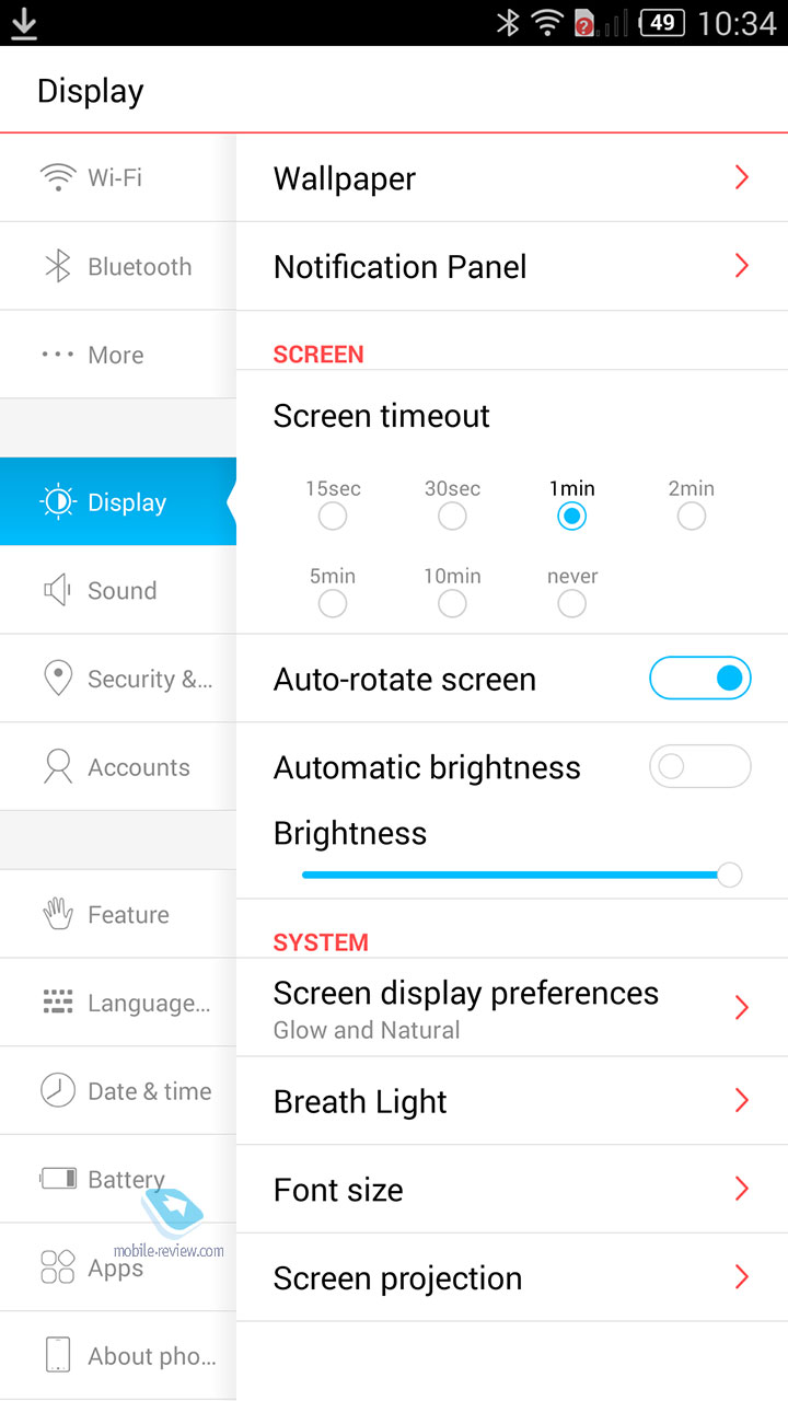 ZTE и Huawei Mate 7 ДисплейВ ZTE Nubia 7 MAX установлен экран, диагональ которого составляет 5.5 дюйма. Снова производитель идет на поводу у моды на увеличение размера экрана. Физический размер – 68х122 мм, рамка сверху – 14 мм, снизу – 17 мм, справа и слева – чуть менее 4 мм. Разрешение, в отличие от Nubia 7, здесь FullHD, то есть 1080х1920 точек – это 400 пикселей на дюйм. Вполне приличный показатель, пикселизация не бросается в глаза, детализация отличная. Матрица выполнена по технологии IPS, воздушная прослойка межу стеклом и экраном отсутствует. Углы обзора большие, под наклонами дисплея картинка не искажается, не фиолетит и не желтит, немного уменьшается яркость. Белый цвет мне показался максимально натуральным; «глубина» черного цвета хорошая, засветки матрицы нет. Цвета насыщенные, приятные глазу. В настройках присутствуют три пункта насыщенности и три пункта выбора цветовой температуры. Советую оставить все как есть по умолчанию. В целом, дисплей Nubia 7 MAX оставил только положительные впечатления. Сенсорный слой отрабатывает до 10-ти одновременных касаний. Чувствительность отличная. Настройки экрана: