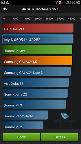 ПроизводительностьВ данной модели стоит один из самых производительных чипов – Qualcomm Snapdragon 801 MSM8974AC: 4 процессорных ядра на архитектуре Krait 400, частота каждого может достигать 2.5 ГГц, техпроцесс 28 нм. В качестве видеоускорителя используется Adreno 330 (578 МГц). Более подробно о чипе прочитайте на официальной страничке здесь. До обновления прошивки аппарат вел себя крайне нестабильно: перезагружался, грелся, во время разговора мог сбросить вызов и не мог обновиться сам, что самое печальное. Пришлось «апдейтить» вручную. На данный момент самая свежая Firmware – V14.07.25 или же номер сборки NX505J_CNCommon_V1.41, версия Android 4.4.2. Именно на этой прошивке все стало на свои места. Смартфон перестал тормозить и глючить. Игры идут без каких-либо проблем. Скриншоты из игр: