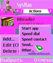 SysMan. Еще одна утилита от SymbianWare. Сайт www.symbianware.com. Тип распространения: Shareware . Цена программы 14.95 Евро Отличный помощник в контроле над запущенными приложениями. Полностью заменяет стандартный менеджер задач. Позволяет создать и сконфигурировать папку «Favorites», в которую можно внести список контактов для быстрого вызова и отправки сообщений по SMS, MMS или e-mail. Из этой же папки можно запускать приложения. Основной функцией SysMan является замена стандартного менеджера задач. Используя эту программу любому приложению для запуска можно назначить кнопку «быстрого вызова». Кроме этого программа позволяет закрывать все запущенные процессы, сжимать память, получать детальную информацию о запущенном процессе, производить рестарт телефона. Основное окно программы позволяет получать доступ к активации/дезактивации программы. На следующей закладке – «General Settings» - можно создать папку для быстрого запуска («Favorites»), указать ее название или переименовать. На закладке «Action» выбираются приложения и контакты для быстрого доступа. Из этого же пункта можно выбрать адресата для отправки SMS, MMS и e-mail сообщений. На закладке Look and feel можно установить уровень критичного заряда батареи и памяти. При наступлении такого события телефон вас о нем своевременно известит. Через опцию цикличных приложений в список, активируемый по нажатию кнопки меню, можно добавить свои задачи. Чрезвычайно удобная и популярная программа. В тандеме с AppMan представляет самые продвинутые функции управления процессами и максимально облегчает набор сообщений и вызов абонентов.